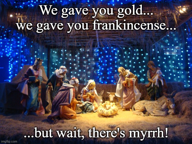 What about the gifts they brought? Well, the reasons for the gifts range from highly practical to possibly symbolic. I tread cautiously into the symbolic because we have to be careful when implying intent that is not stated outright. On the practical level, these gifts were very valuable. The gift of gold is obvious – having a baby is expensive! Frankincense was used for a variety of reasons – it was used for incense, perfume, some cultures used it for medicinal purposes, and it was also used during worship. Myrrh also has many uses – in perfumes, in medicines for digestive issues, for purification, and for embalming.